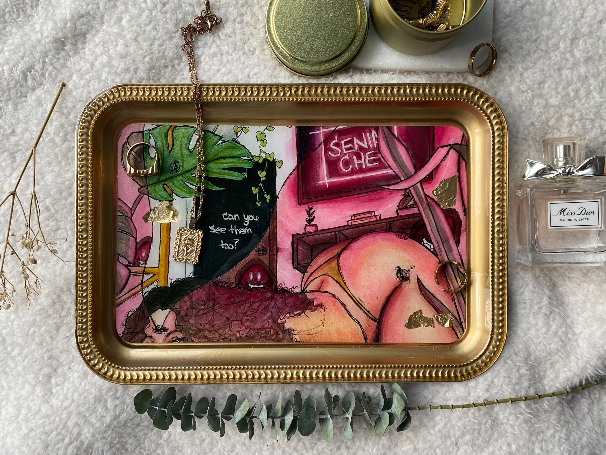 As functional art, this tray will be just as useful as it is beautiful! Use it to roll tobacco, display jewelry and crystals, place a plant and/or candles for decor, toss your keys and change on it, keep your make up, perfume, bathroom toiletries or just admire it for the art it is! The gold details will add a little luxurious touch to any dresser, vanity, night stand or coffee table. Trays are 7.65"x11".