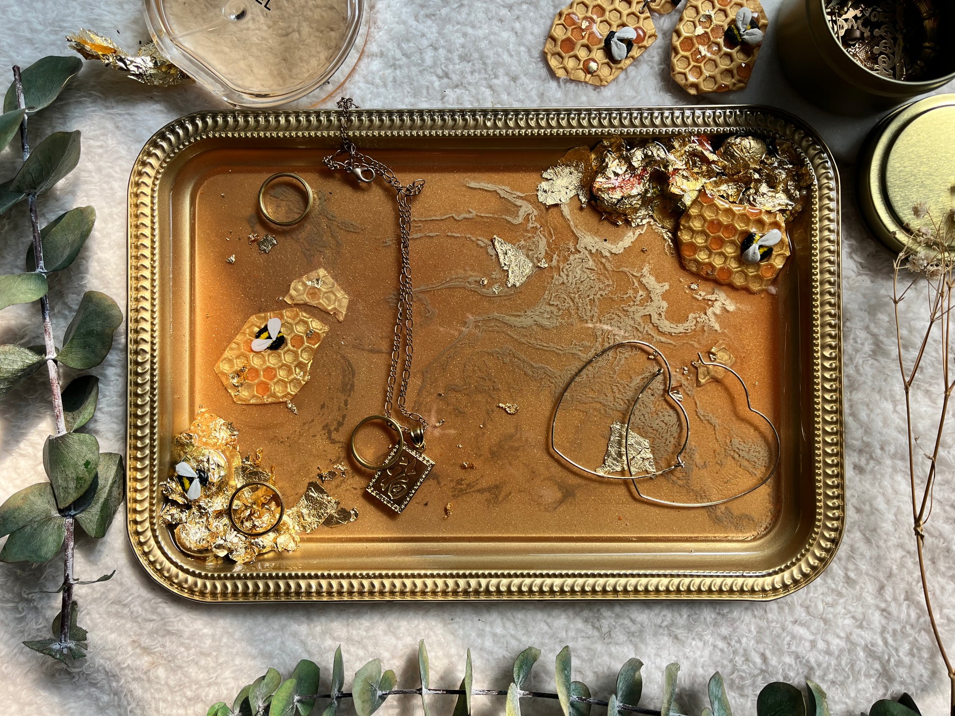 As functional art, this tray will be just as useful as it is beautiful! Use it to roll tobacco, display jewelry and crystals, place a plant and/or candles for decor, toss your keys and change on it, keep your make up, perfume, bathroom toiletries or just admire it for the art it is! The gold details will add a little luxurious touch to any dresser, vanity, night stand or coffee table. Trays are 7.65"x11". Every tray is handmade so there will be slight variation in color, pattern and gems used. Honeycombs and bees are handmade with clay!
