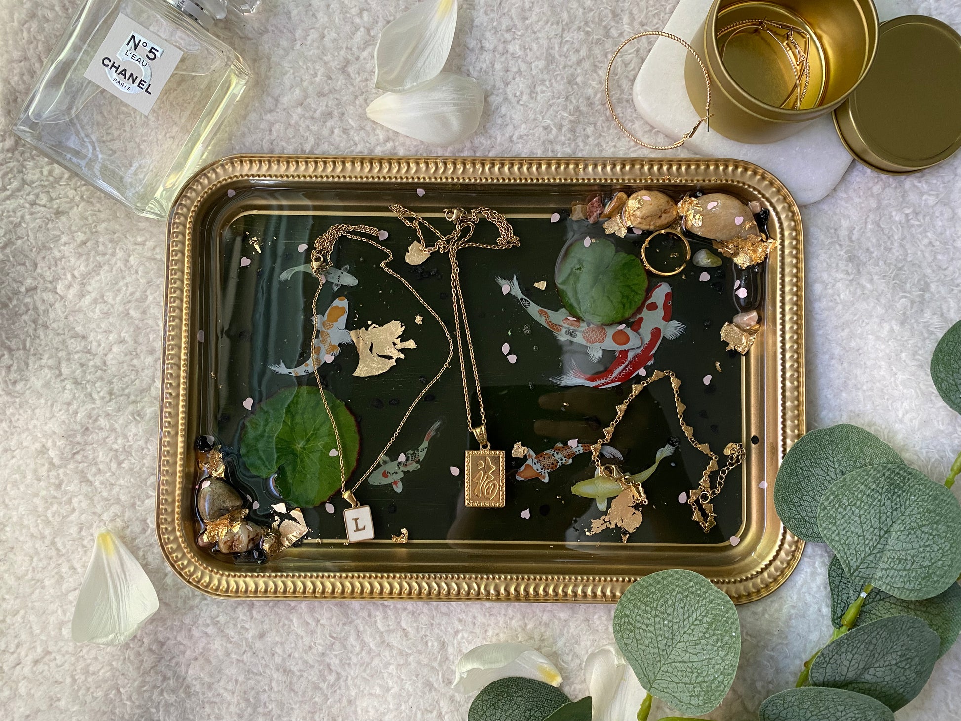 As functional art, this tray will be just as useful as it is beautiful! Use it to roll tobacco, display jewelry and crystals, place a plant and/or candles for decor, toss your keys and change on it, keep your make up, perfume, bathroom toiletries or just admire it for the art it is! The gold details will add a little luxurious touch to any dresser, vanity, night stand or coffee table. Trays are 7.65"x11" rectangles, oval trays are discontinued. Every tray is handmade so there will be slight variation in color, pattern and gems used.
