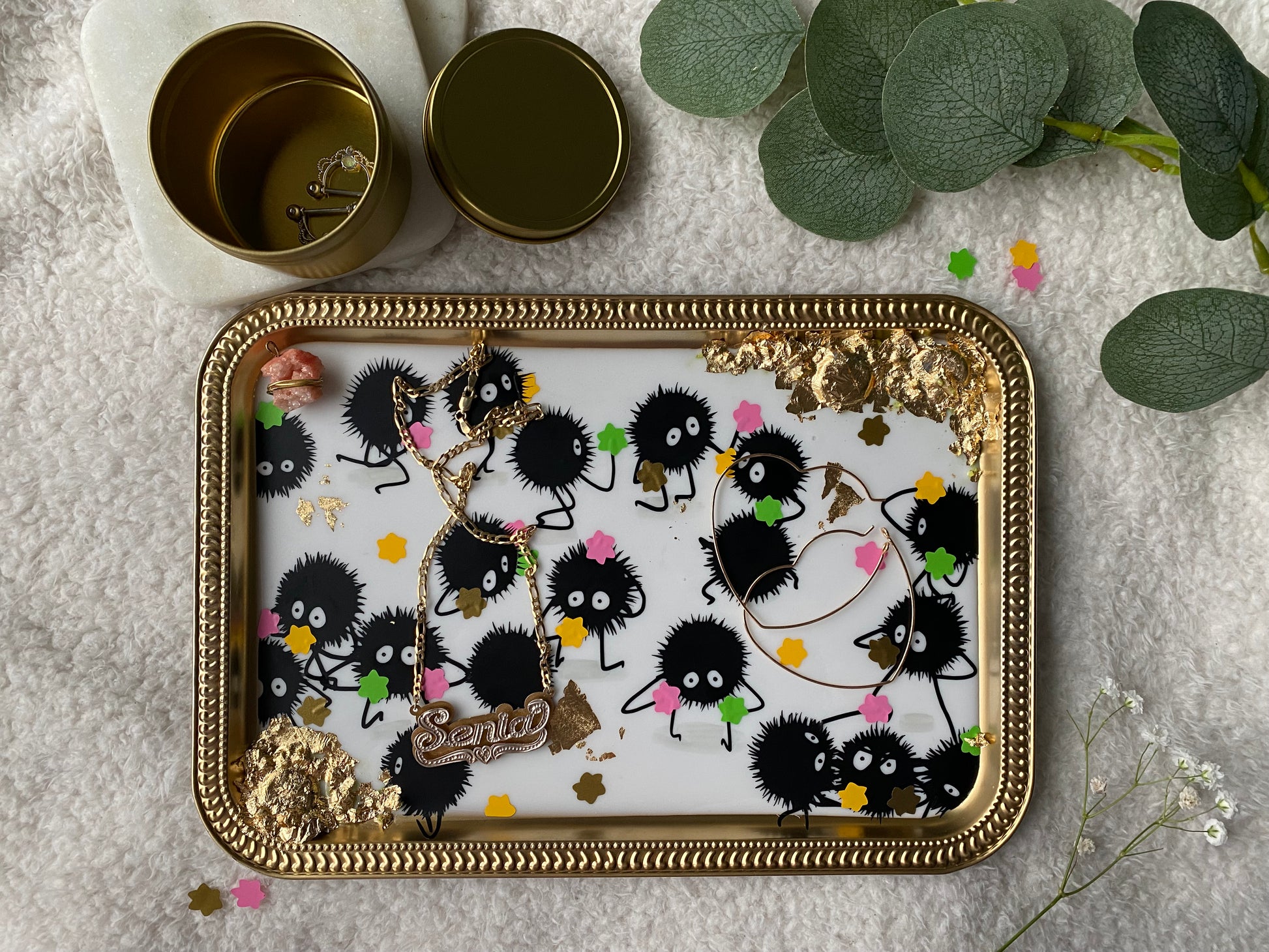 As functional art, this tray will be just as useful as it is beautiful! Use it to roll tobacco, display jewelry and crystals, place a plant and/or candles for decor, toss your keys and change on it, keep your make up, perfume, bathroom toiletries or just admire it for the art it is! The gold details will add a little luxurious touch to any dresser, vanity, night stand or coffee table. Trays are 7.65"x11". Every tray is handmade so there will be slight variation in color, pattern and gems used.